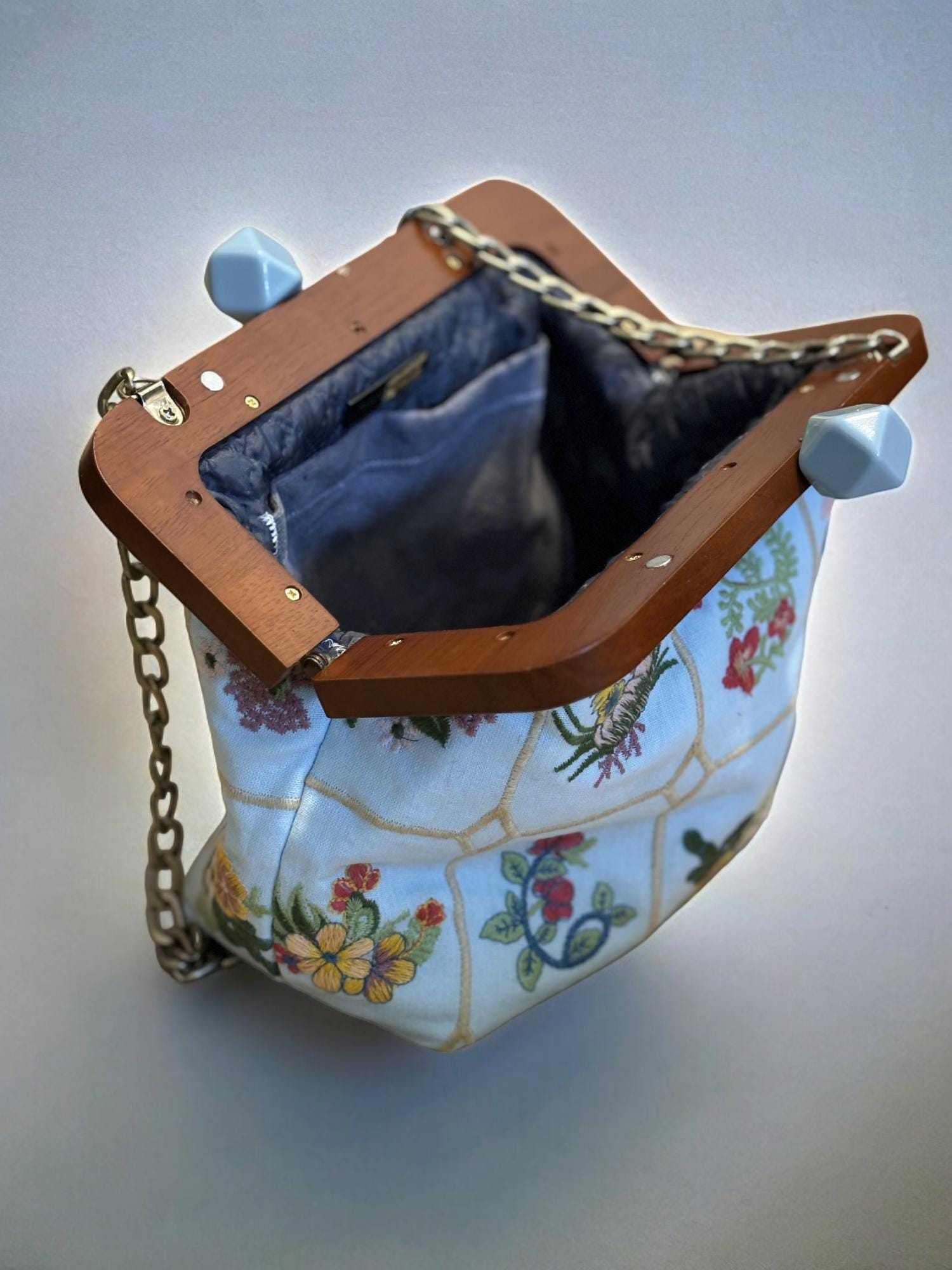 Handmade Light Blue Clutch | Elegant Floral Cotton Evening Bag | Gold Chain Loop Purse | Feminine Floral Evening Clutch | Bridesmaid Gift